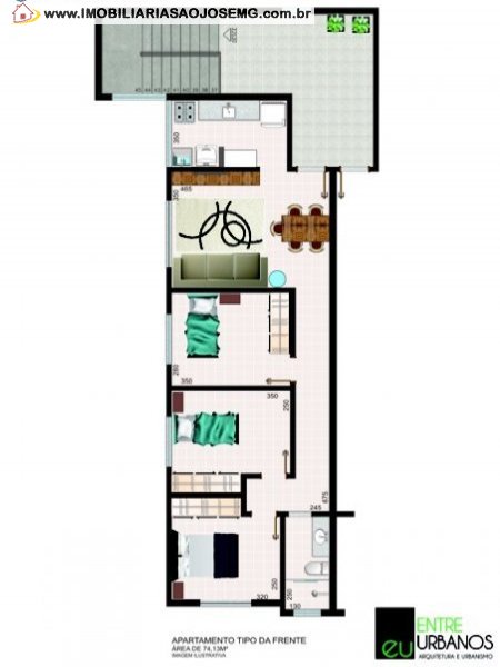 Apartamentos de 03 quartos com 74m² aproximados.